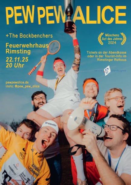 Pew Pew Alice ist eine Chiemgauer Kultband, die deutschlandweit unterwegs ist. Nach dem Gewinn des Nachwuchswettbewerbs "Münchens Act des Jahres 2024" spielt sie zum ersten Mal in ihrer Heimatgemeinde. Karten sind erhältlich bei der Tourist Info im Rathaus Rimsting sowie an der Abendkasse. Die Veranstaltung wird gefördert vom Bezirk Oberbayern.