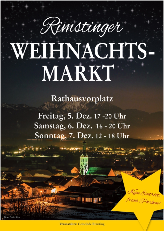 16.00 Uhr: Beginn des 2.Weihnachtsmarkt-Tages mit der Bläserklasse Rimsting 16.30 Uhr: Besinnliches Adventliedersingen in der Pfarrkirche St. Nikolaus Rimsting